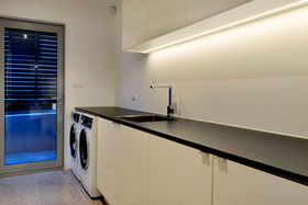 The oversized black glass front door swivels open on a keyless entry system to a light-filled, superbly spacious, two-level interior. There are virtually two homes in one here. The main floor offers expansive open-plan living with the kitchen, including scullery and a family-sized central work island, at the hub of the home. The main bedroom suite is a triumph. The beautifully organised walk-through dressing room and generous tiled ensuite is a pleasure!