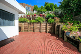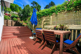 The well-designed, open plan living room offers two adjacent living areas and a large central kitchen with a generous amount of bench space. Bathed in sunshine, this is a wonderfully large area for everyday family life and entertaining. The large outdoor deck is accessible from sliding doors and enjoys the backdrop of a much-loved tiered garden that flourishes with vibrant flowers throughout the year.
