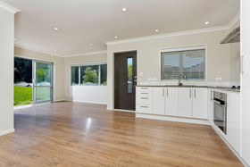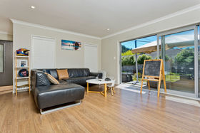 - Open-plan living that's light, bright and welcoming - complete with a modern kitchen, laminate wood flooring and great flow out through sliding doors to the spacious lawn outside.
